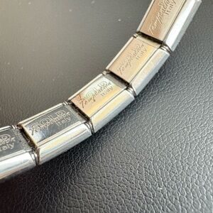 Gold temptation Italy vintage charm bracelet. It has three colorful charms and the rest are a standard silver. They're all made out of stainless steel. The brand on each one of them is Gold temptation Italy. Inventory 34.