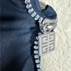 The image shows a dark blue Givenchy Parfums garment bag with a silver-toned zipper and hanger. The bag features a small, rectangular silver plate with the "GIVENCHY" logo in capital letters. Garment bags, like the one pictured, are designed to protect clothing during travel and storage, keeping them wrinkle-free and dust-free. Givenchy is a French luxury brand known for its haute couture, accessories, and fragrances. The garment bag appears to be made of a durable, possibly water-resistant material, suitable for travel.