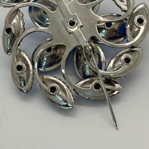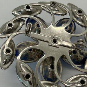 A mid-century brooch featuring blue Plastic acrylic cabochons and rhinestones arranged in a floral design. Rivet-set with a secure pin clasp for enduring elegance.