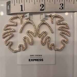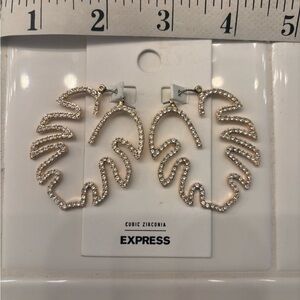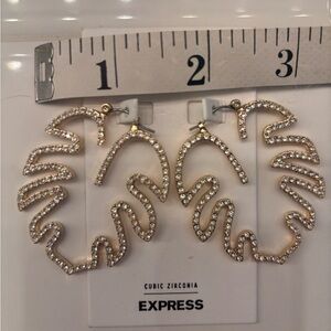 These stunning gold earrings from Express feature a bold leaf design, perfect for making a statement. Crafted with a cubic zirconia textured surface, they capture the light beautifully, adding a touch of elegance to any ensemble. Ideal for those who love unique and eye-catching jewelry.