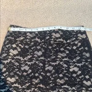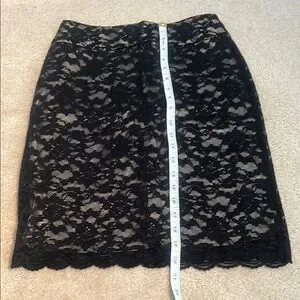 This knee-length pencil skirt features a striking black on tan color palette, perfect for a cocktail or night out. The lace design adds a touch of glamour, while the form-fitting silhouette ensures a flattering fit. Its intricate detailing makes it a standout piece in any wardrobe. Size is 00P