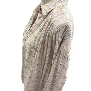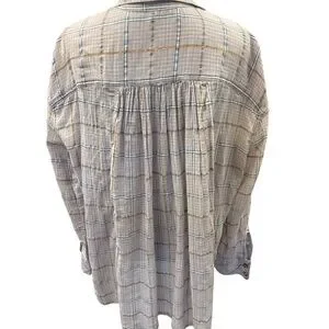 Oversized Chic metallic plaid button-up shirt with a stylish design. Features a blend of beige and gold tones.