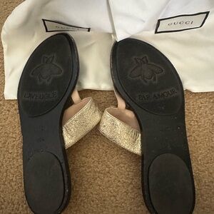 Stylish Gucci sandals featuring a metallic strap and gold logo. Perfect for any occasion. Only worn a few times. Comes with box and dust bags