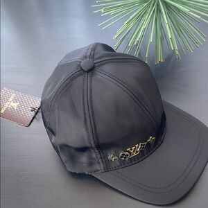 Stylish black cap featuring a gold Louis Vuitton logo. Perfect for casual wear. Brand new with tags. Never worn.