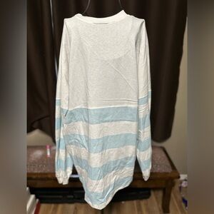 DETAILS: Blank with no design. Trademarked garment design: Dropped shoulders, double needle cover stitch yoke, long cuffed sleeves, banded neckline and curved hem. Flag label at side.