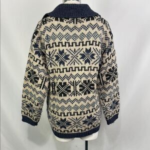 Stay warm and stylish with this navy and cream patterned men's sweater. Perfect for any casual outing.