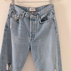 Looks Like: Light vintage indigo denim with destruction at the knees
