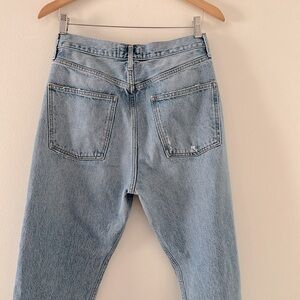 This 90's-inspired fit, crafted from light vintage indigo denim with subtle knee destruction and regenerative cotton, offers a relaxed mid-rise, an eased fit through the hips, and a loose, straight leg— effortlessly styled with anything from a classic white tee and sneakers to an oversized blazer and heeled boots for an elevated,