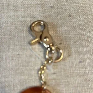 Elegant Purse Charm with a brown oval pendant. Features a secure clasp in gold hardware.
