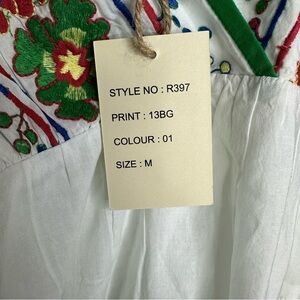 This beautiful RAGA mini sundress is perfect for any bohemian fashion enthusiast. Made in India from 100% cotton, this white dress features an intricate embroidered design and strappy sleeves. With a V-neckline and pullover closure which falls into a short baby doll. The dress has a floral pattern and a bohemian theme, making it a perfect addition to any boho-chic look.