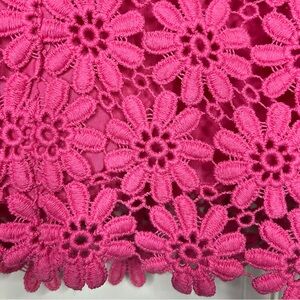 This stunning pink sheath dress by Lilly Pulitzer features a strapless neckline and a form-fitting silhouette, perfect for cocktail events or weddings. The vibrant lace fabric adds a touch of elegance and sophistication, making it a standout choice for any special occasion.