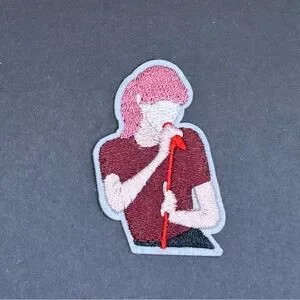 Stylish embroidered patch featuring a singer. Perfect for jackets or bags. Red and pink tones add a vibrant touch.