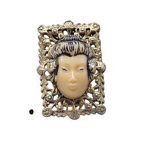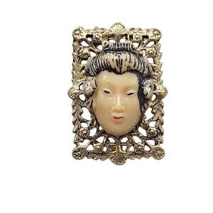 Selro Asian Geshi Clip On Earring Lucite Lady 3D Rectangle Filigree Vintage