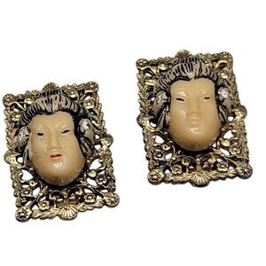 Discover timeless elegance with these vintage Selro Asian Geshi clip-on earrings. Featuring a 3D Lucite lady set in a rectangular filigree design, these earrings offer a unique and sophisticated touch to any outfit. Perfect for vintage jewelry enthusiasts and collectors.