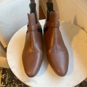 Chelsea ankle boot with buckle, calfskin leather, 1" flat stacked heel. Approximately 5" shaft, stretch side panels, buckled front strap, leather lining and sole. Made in Italy.