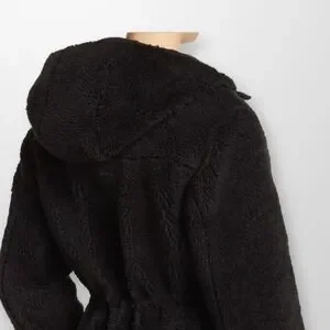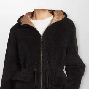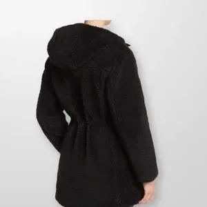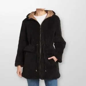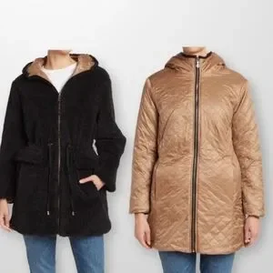 Stay cozy and look chic in this reversible faux shearling coat featuring a smooth quilted lining with an attached hood, drawstring waist, and convenient pockets.