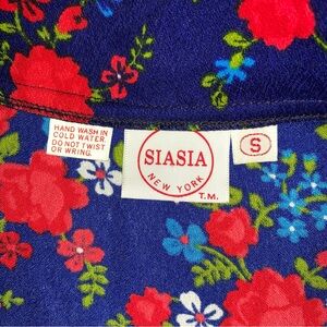 Blue long sleeve buttoned shirt with beautiful whimsical floral pattern in red, blue, green & white