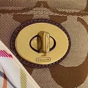 Exterior: Signature monogram print canvas body in brown and tan color. Bronze color leather trim. 4 silver feet at the bottom with normal signs of wear (micro scratches). Gold turn-lock closure at the front secures a large pocket; the turn-lock has a couple of scratches on the turnknob. 1 large slip pocket at the back side of the bag. Strong snaps at each side to cinch or expand the bag. 2 bronze-color leather straps. Zippered closure to the main compartment of the bag - opens and closes smoothly. 1 double-sided cream twilly scarf with a polka-dot pattern on one side and a plaid pattern on the other side. Faint rubbing at the bottom corners of the bag. Authentic Coach heat-stamped medallion hang tag included.