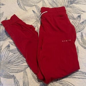 Stylish red joggers with a high-waisted fit. Features a white drawstring and NVGTN logo. Used condition