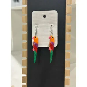 parrot earrings feature hand-painted details on lightweight wood. Displaying vibrant colors including orange, red, purple, pink, and green. The earrings have silver-tone metal hooks for pierced ears. Minor paint imperfections are visible, indicating the handmade nature of the item.