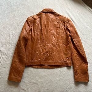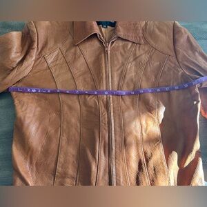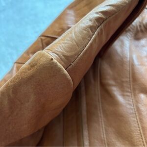 Elevate your style with this vintage Wilsons Tan Leather Jacket. The color is a beautiful and rich camel color. 100% real leather. Front zipper and collared. Size 40. This jacket looks so good paired with a midi denim skirt or jeans. Can easily be dressed up or down. In great condition. Minor imperfections are pictured in the photos. When it comes to leather jackets, I don’t see minor scuffs as imperfections. I think they add to the overall worn patina and give in an effortless sense of cool. Offers welcome.
