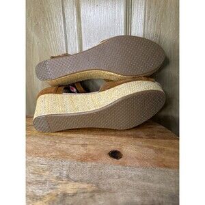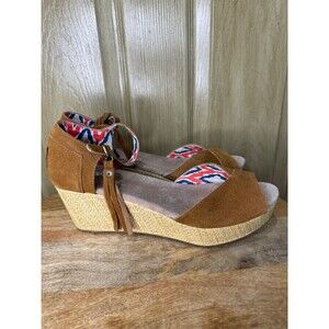 Womens Toms Shoes Wedge Heel Sandals Brown Suede Tassle Ankle Strap Sz 8.5