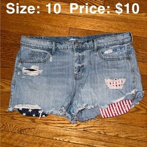 Stylish denim distressed shorts with a unique American flag patch design. Perfect for casual outings and summer days.