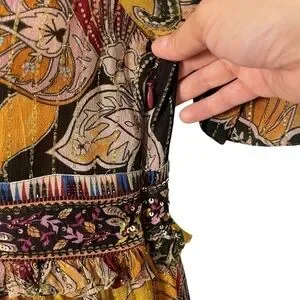 Gorgeous Indian-inspired dress/tunic adorned with beading and sequins. This piece is beautiful, exotic, and unique. There are many details in this piece and a few small flaws were noted, such as a small pull on the golden tinsel that runs through the material. A few beads are likely missing as well. These small imperfections are not noticeable due to how busy the piece is.