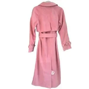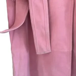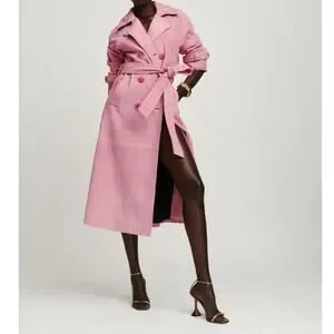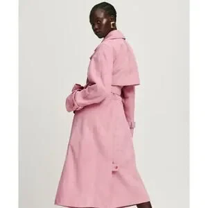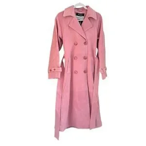 Reformation Veda Ashland Leather Trench in Pink. Size XS / Extra Small. Features double breasted, notched lapel, suede fabrication, detachable belt, lined, button closure. 100% genuine lamb suede leather. Style 1311588. NWT / New with tags, light dust marks from floor on one end of belt both sides Sold as is. Retail $748.