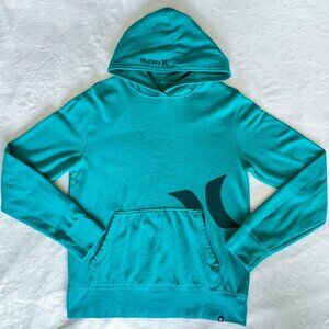 Men's Hurley hooded sweatshirt. Teal color. Lightweight fabric. Large printed Hurley logo on front right above front pocket on left side. Small brand name and logo printed on front, left edge of hood. No drawstring on hood. Front pouch pocket. Small stitched on tag with Hurley logo on front, bottom left side. Size medium. 80% cotton 20% polyester.