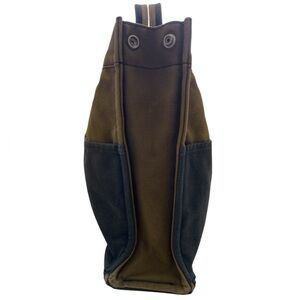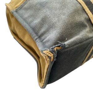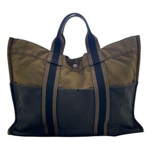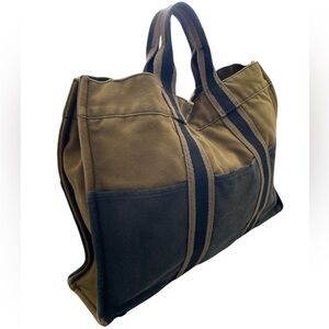 Hermes Stylish and durable two-tone canvas tote bag. Perfect for everyday use with ample space for essentials. Features a sleek design with black and brown