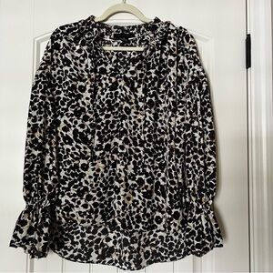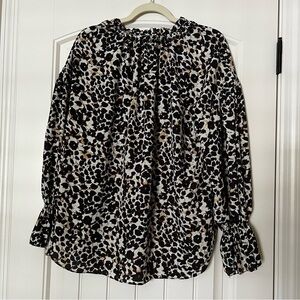 Sanctuary cheetah print long sleeve dressy blouse. Ruffled stand collar with keyhole tie neck, ruffled sleeve cuffs. Lightweight crepe chiffon fabric. Relaxed fit. FLOWY