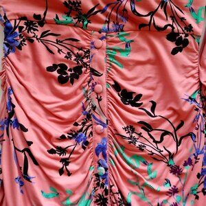 Gorgeous long-sleeved mini dress features long sleeves, an all-over floral print on a bubblegum pink background, ruching, and button details. The beautiful, soft, and stretchy fabric hugs your curves in the body flattering way.