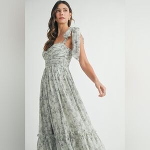 MABLE Floral Bust Ruched Midi Dress with Shoulder Tie Light Sage Green