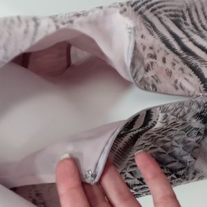 Like new condition! This a purple/pink mauve color with black. Deep V-neck and V in back, as well. Slightly tapered at waist with textured detail. Lightweight and loose fit. Lined. Zip hook close at side. 100% Polyester. The size tag was removed. The size provided is based on measurements below.