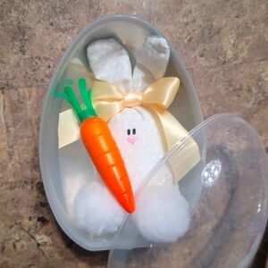 Uniquely crafted and super cute Easter egg. The egg comes apart, and you can set the bunny on the counter without the egg as well. It measures 6 in by 4 in only a few left
