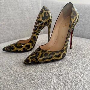 Elevate your style with these Christian Louboutin heels, featuring a striking leopard print in rich brown and black tones. The sleek pointed toe and towering stiletto heel create an elegant silhouette, while the glossy finish adds a touch of luxury.