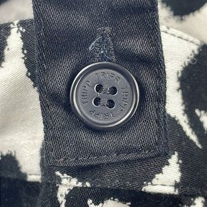 Eye-catching black and white star print suspender skirt from Tripp NYC by Daang Goodman. Features thick adjustable straps with logo buttons, a back zip closure, and a flared silhouette. Made from soft 100% cotton twill with punk attitude and playful edge. Rare style!