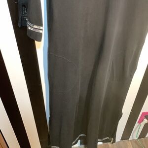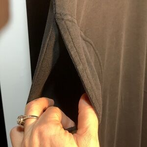 Black 100 percent cotton , long maxi dress w 3/4 long sleeve w slit , 2 good size pockets at the hips , slits at sides of the skirt too for easy walking /movement