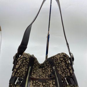 DKNY Brown Tan All Over Logo Fabric Hobo Bag