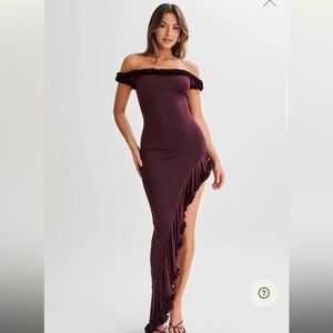 Arielle Meshki Off Shoulder Ruffle Midi Dress - Plum