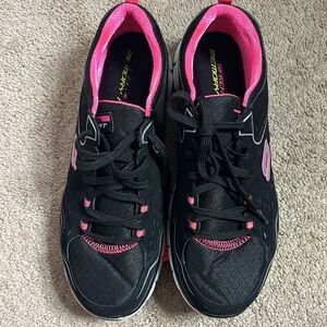 Step into comfort and style with Skechers women's athletic shoes. Featuring a sleek black design with vibrant pink accents, these shoes are perfect for any active lifestyle. Enjoy the perfect blend of fashion and function.