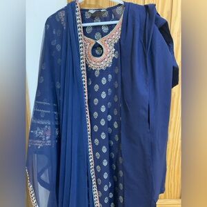 Elegant navy blue Anarkali suit with intricate embroidery. Features gold and red accents. Perfect for special occasions. Frock and churidar pajamas