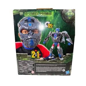 The Transformers Rise Of The Beasts 2-In-1 OPTIMUS PRIMAL Role Play Mask Figure is a black plastic toy featuring the character Optimus Primal from the Transformers franchise. This action figure stands at 9 inches tall and can transform into a gorilla mask for role-playing. Manufactured in 2022 by Hasbro, this original licensed reproduction is part of the Transformers series and includes features such as transforming, boxed packaging, and dress-up play. It is suitable for ages 6 and up and comes with a high-quality design and attention to detail for fans of Transformers and robot-themed toys.