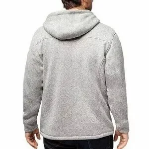 This gray zip-up sweater features a cozy hood and is crafted from a soft, fleece-like material, perfect for keeping warm in cooler weather.