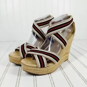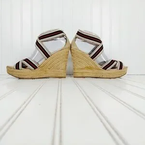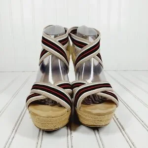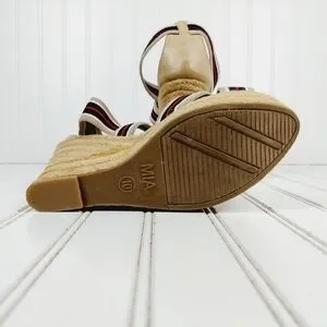MIA Rope Heels Tan Black White Red Striped Ankle Strap Wedge Sandals C4