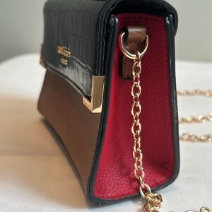 Excellent condition, no flaws. Magnetic snap closure. One top handle. Faux leather in black, brown and red with gold toned hardware, trim, logo.