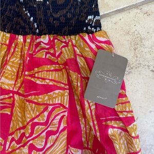 Add a pop of color to your wardrobe with this vibrant pink and gold skirt. Stretchy elastic waist & a fun print. Super cute for spring & summer!