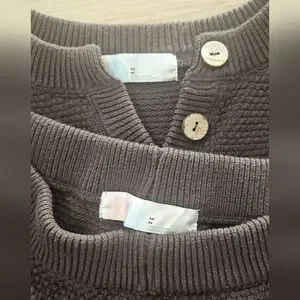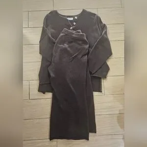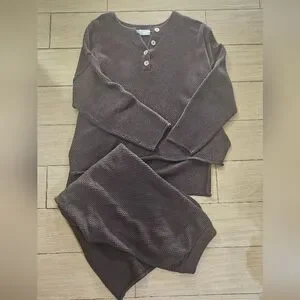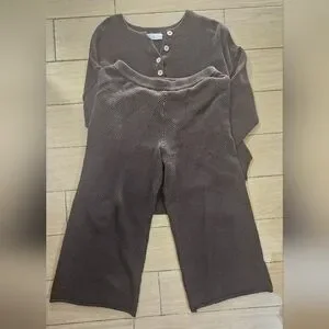 Comfortable knit lounge set. Features a buttoned top. Perfect for relaxing at home.