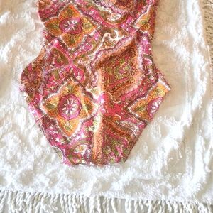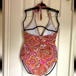Stylish halter swimsuit with a vibrant paisley pattern. Features a mix of pink, orange, and green colors.Tommy Bahama Vibrant Paisley patchwork Halter Swimsuit 4 Euc Box 1